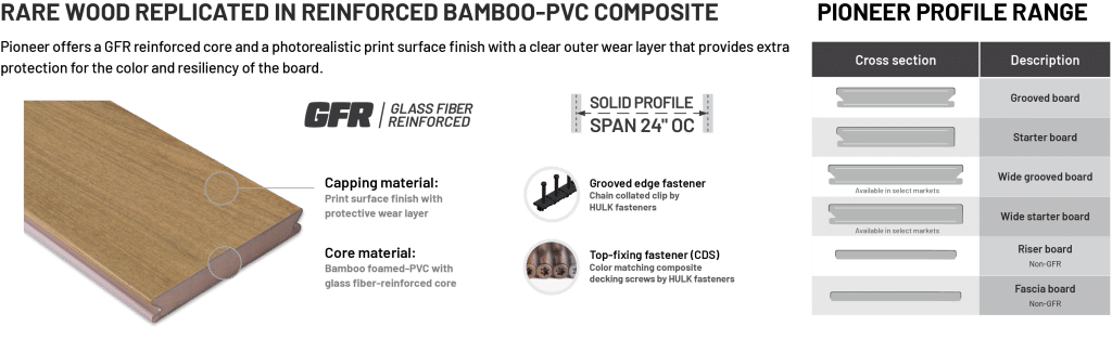 Forged from the same bold spirit that drove history’s pioneers, Pioneer composite has been created to challenge perceptions, push boundaries, and create something that redefines composite. As aged and exotic hardwoods become harder to source, and as forests become increasingly monitored and regulated, a composite which perfectly replicates the look of these prized timbers becomes the smarter, more convenient, and more sustainable way forward.